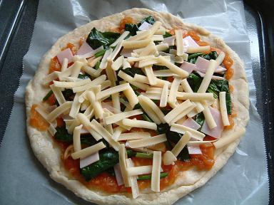 炒めた具とハム、チーズをトッピング。