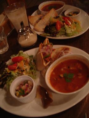 トマトスープ、サラダ、豆マリネ、ピタパンサンド。